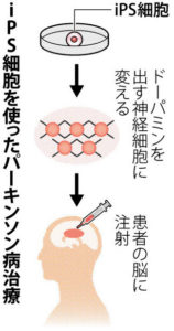 今日のニュースで、この話題をやっていました。iPS細胞(人工多能性幹細胞)とは、皮膚など成体の細胞にいくつかの遺伝子を人工的に導入してつくったもので、培養して増殖させることができ,適当な因子を加えることなどで体を構成するほとんどすべての細胞にできる。また、パーキンソン病とは、円滑な運動を行うのに重要な役割を担う脳の一部に異常が生じることで発症する病気です。